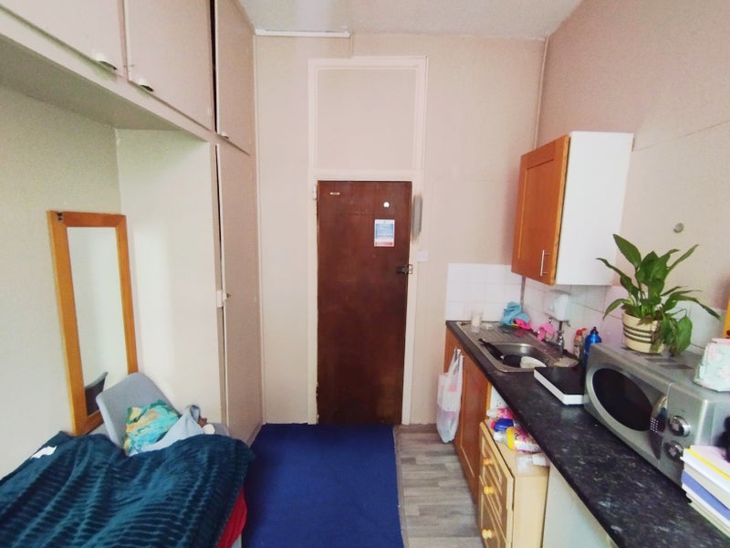 The room: I live in a house full of students where the toilets and showers are shared. No common area. There's a kitchen, heating and wifi in the room, also a small desk, and a single bed.