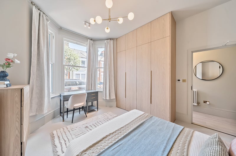 A beautifully finished double bedroom which lets in plenty of light and comes with a desk for working from home!
