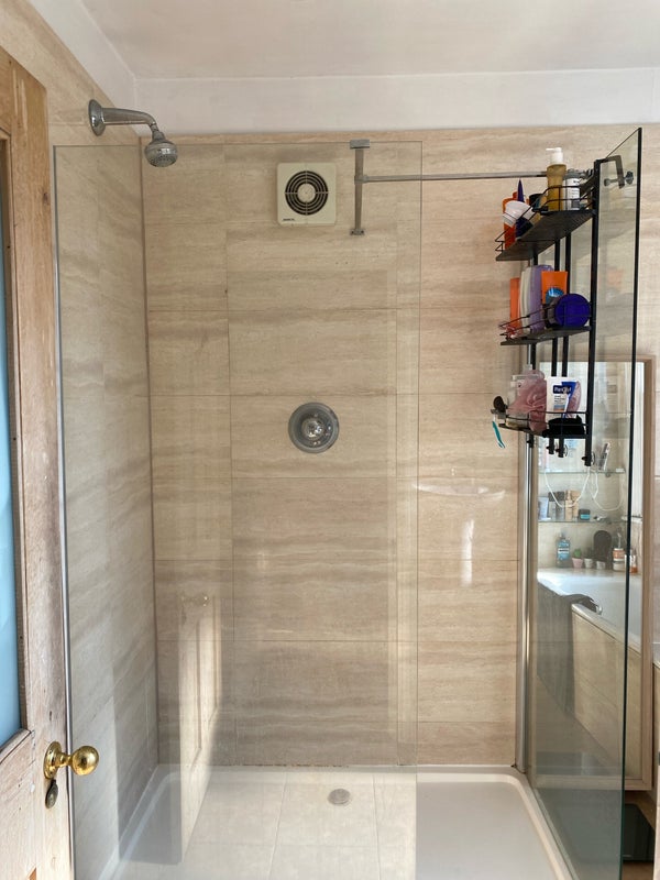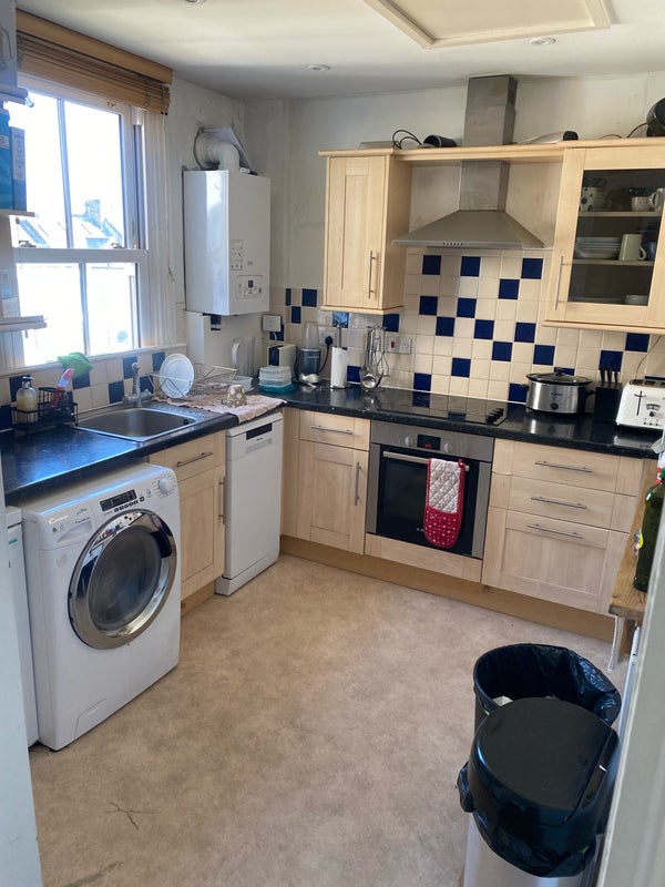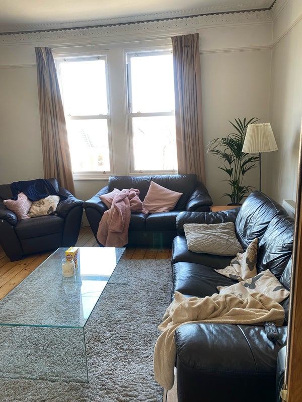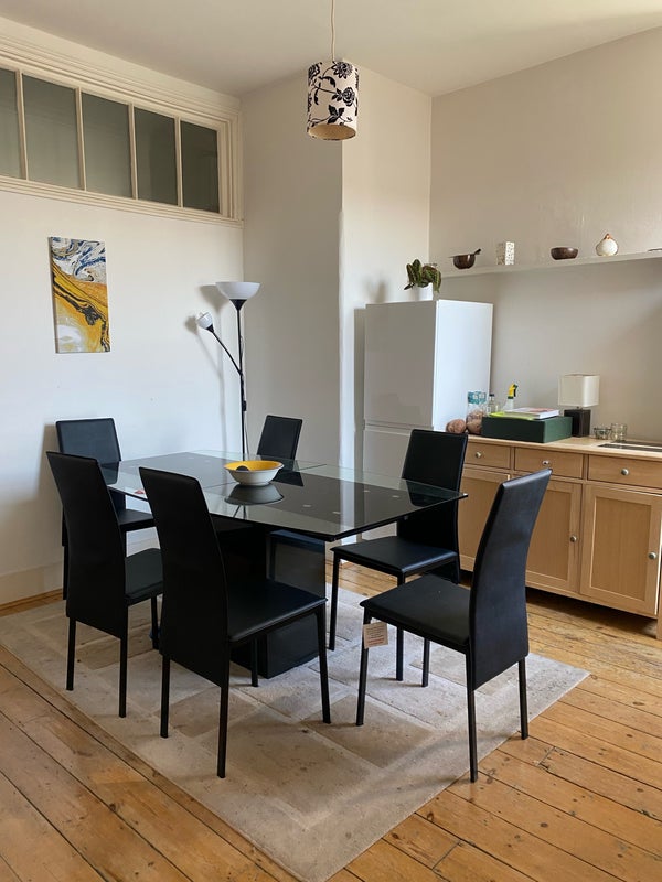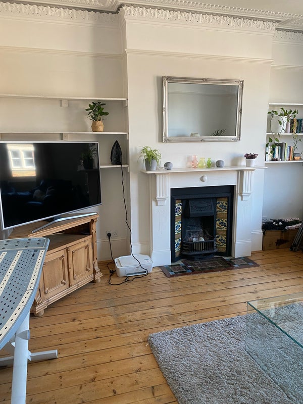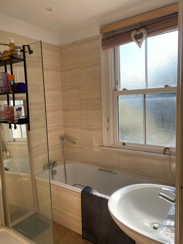 It’s a beautiful three-bed flat with one bathroom (shower + bath) and a toilet. Big living room, dining room and kitchen. A communal garden for the building.