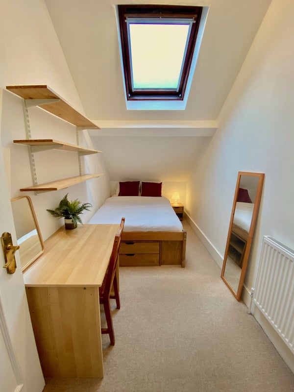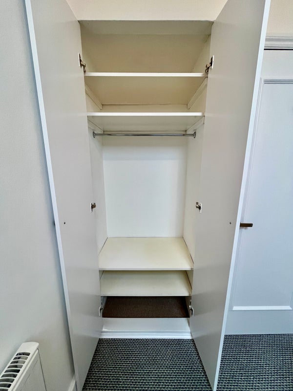 The room has all furniture including a double bed, built-in wardrobe, desk, chair and shelves.