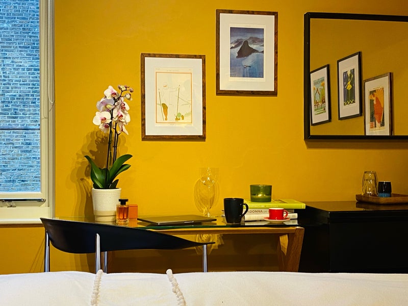 The room is on the first floor with its own private bathroom (a separate bathroom with a large bath and lavatory). There is a comfortable double bed (140x200) with brushed-cotton linen and an entire pillow collection, blackout blinds, a desk, ample storage, good lighting and fast Wi-Fi. Towels are fresh, the room is kept in good order and everything simply works. There is a Nespresso and kettle in the room for mornings when coffee in pyjamas feels preferable to immediate civilisation.