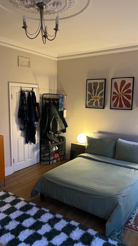 In terms of furniture in the room, the bed, wardrobe and chest of drawers all belong to the house. The rest is the current tenants so will be gone.