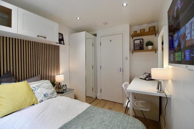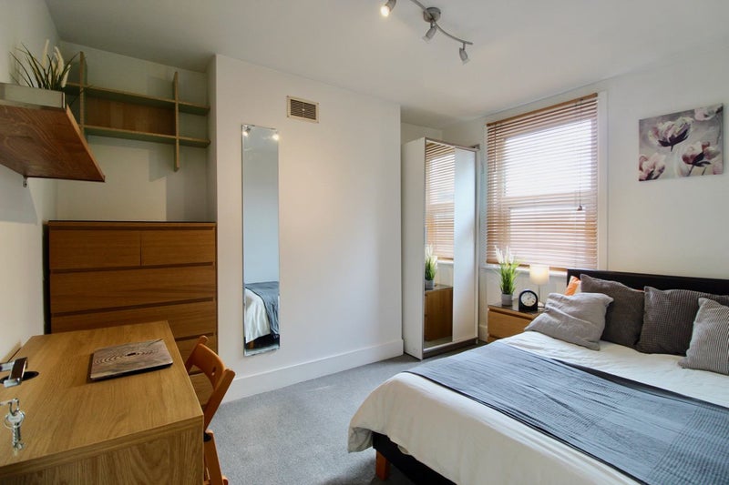 This bright double room is light and spacious with high ceilings and has a double bed, a larger and taller than usual wardrobe, desk, chest of drawers and bedside table. There is a large window providing plenty of natural light and Venetian blinds are fitted to the windows.