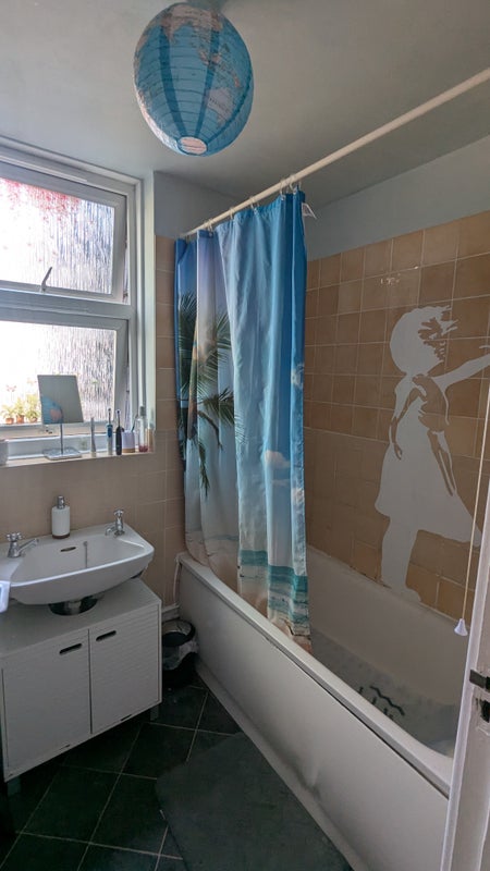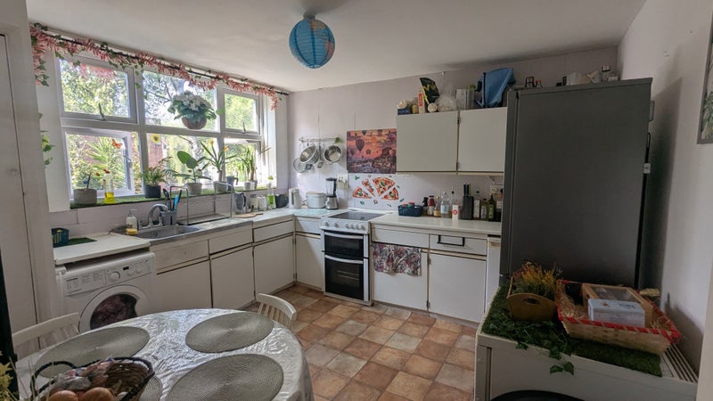 There is one toilet and one bathroom in the house with some abundant storage space too. There is no living room in the flat but the kitchen is very spacious and bright, big enough for all tenants to cook and eat together or to have guest over for dinner and drinks (we do get social at weekends so this is perfect!).