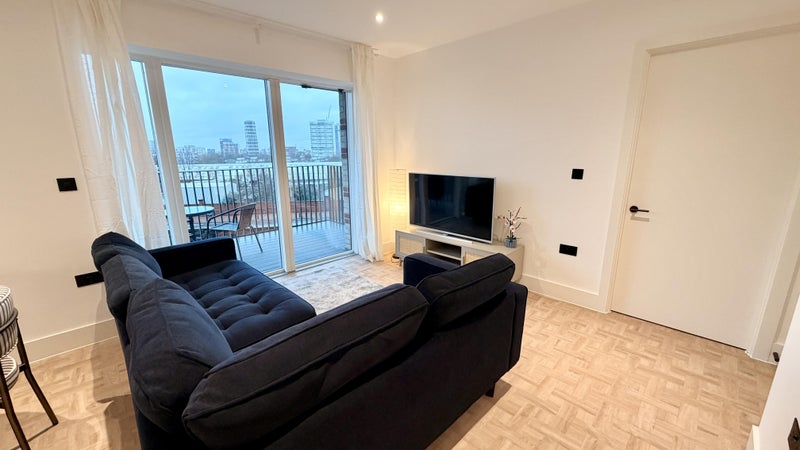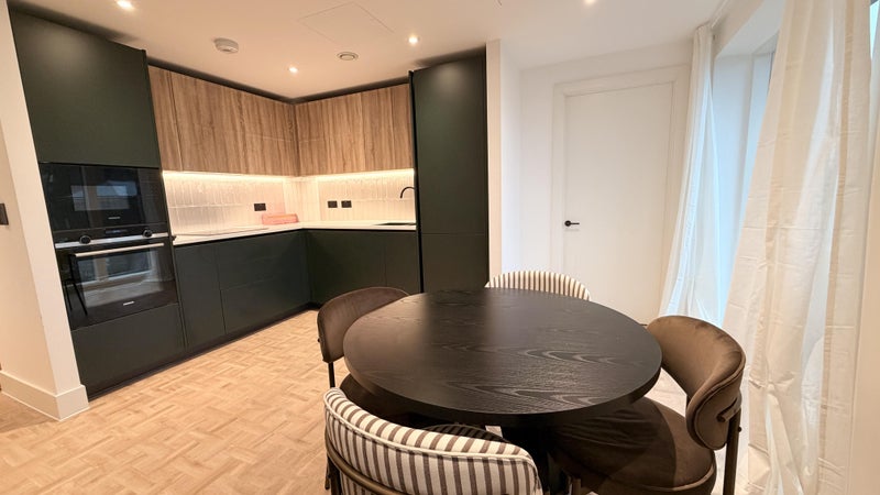 Step into a light-filled open-plan living space, featuring floor-to-ceiling windows that flood the interior with natural light and frame panoramic views over the vibrant London skyline. The sleek, fully equipped kitchen flows seamlessly into the living and dining areas, creating a perfect environment for both everyday living and entertaining. The private balcony/terrace invites alfresco moments and extends your living space outdoors.