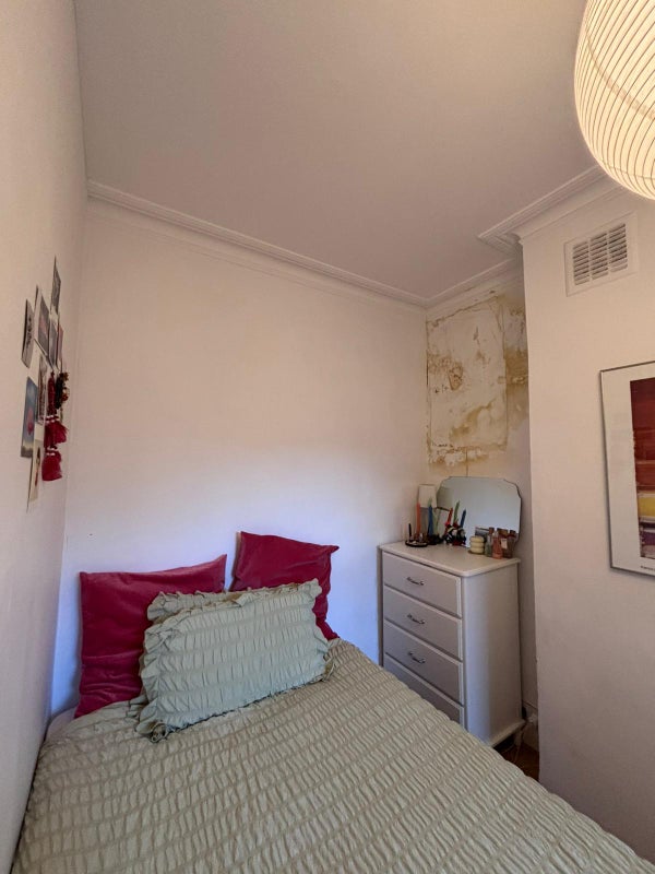 The room will include bed and mattress, chest of draws, wardrobe and wall mirror. The stain on the right hand wall is from a previous leak that the landlord is currently fixing! Doesn’t smell or grow mold! You will also be sharing the living area and bathroom.