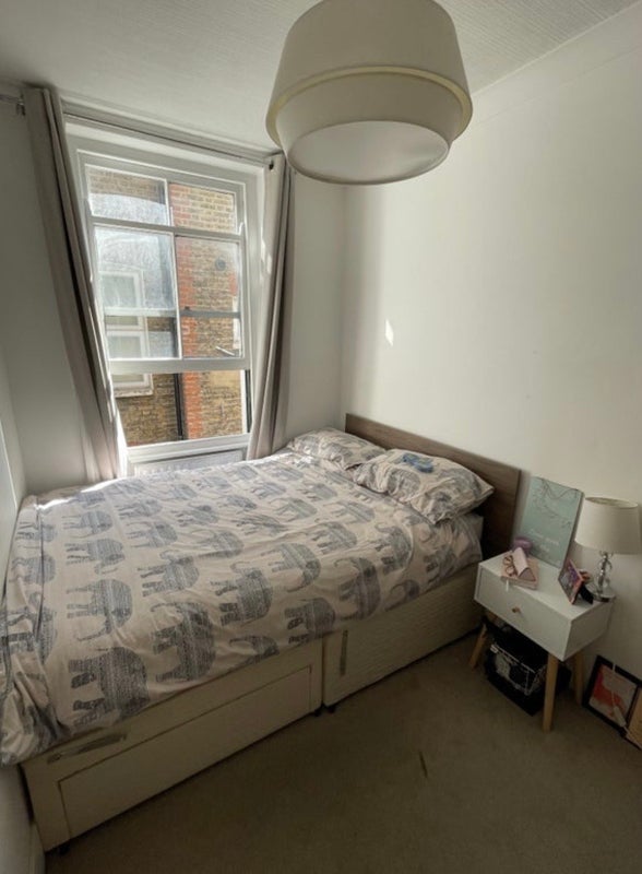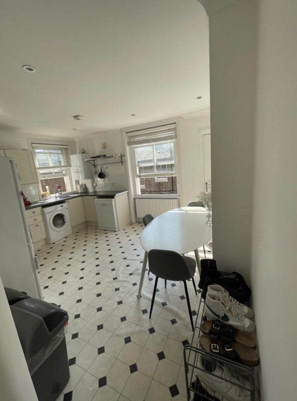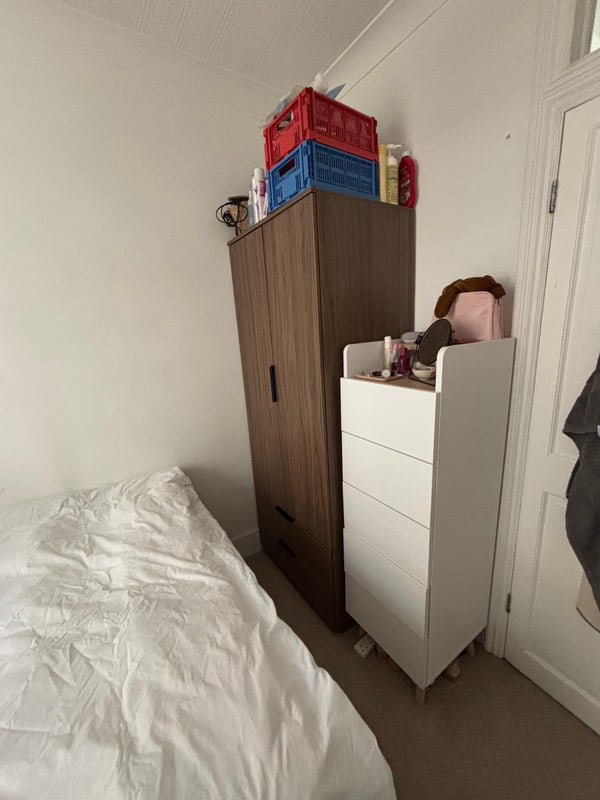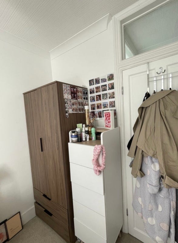 The room available comes with the bed, mattress, wardrobe and chest of drawers. It's a cosy space with limited room for a desk so this room would be most suitable for someone who doesn't work from home very frequently. There's good storage in the room and in other spaces around the flat. Photographed are two previous layouts of the room for reference. Large kitchen and living area which gets loads of natural light.