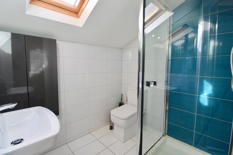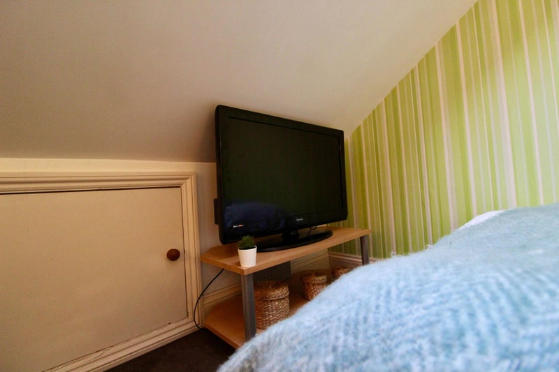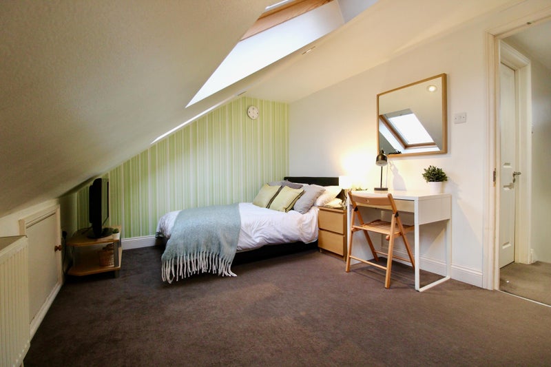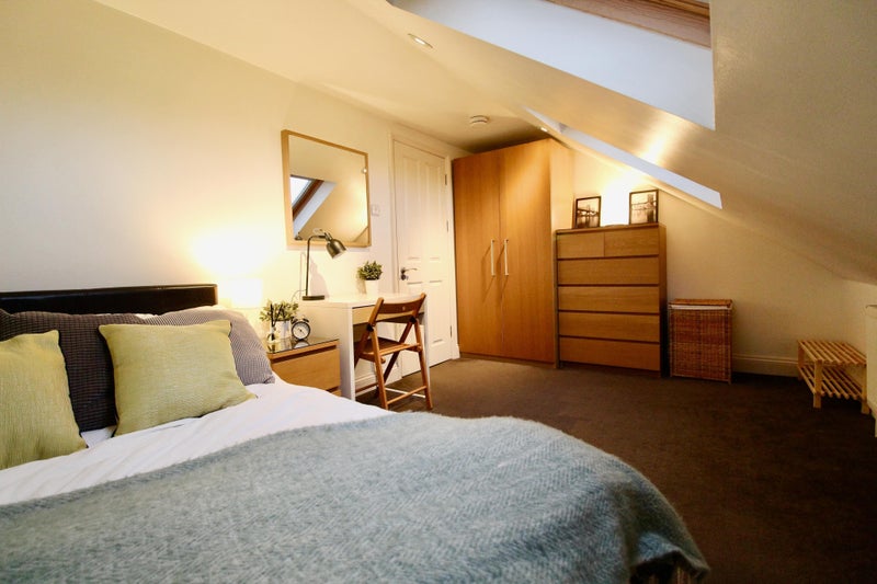The bedroom is nicely furnished and decorated with a double bed, wardrobe, drawers and a desk & chair. Velux blackout blinds are fitted to the windows. The room also benefits from being at the top of the house.