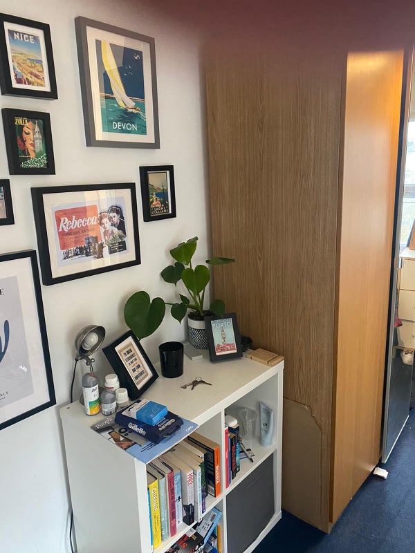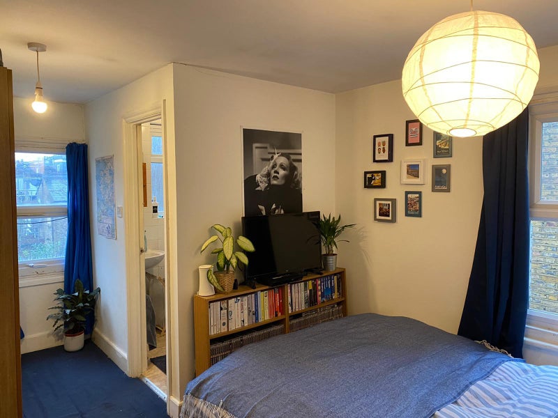 The room is furnished and has an ensuite. Our housemate will be taking the white cube shelving opposite the bed with him, so there will be room for moving furniture around and fitting a small desk in to work from home.