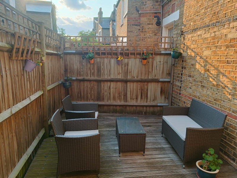 Bright flat with decked garden on a quiet residential street, Available from mid-October. Wandsworth Council Tax Band D.