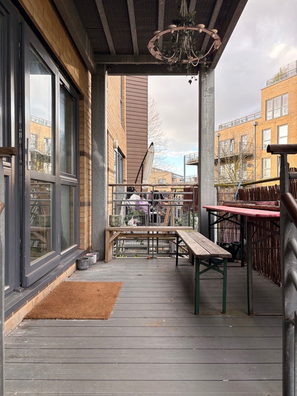 The flat has three toilets. The living room and kitchen are downstairs, with access to a large balcony that has stairs leading directly to the street (which we often use as the main entrance). There is also a second balcony, shared with Mollie.