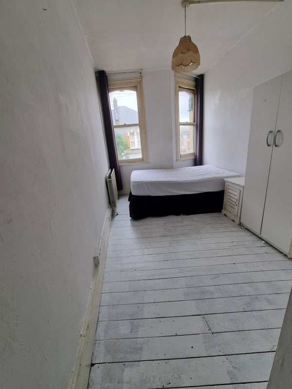 This is a double bedroom in a Lower Clapton Houseshare. The room has 2 large original sash windows and white painted floorboards. The room is warm and cosy through the winter as the heat rises up to it on the top floor