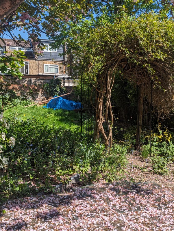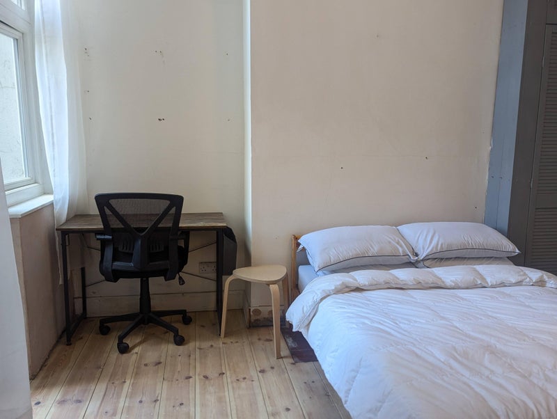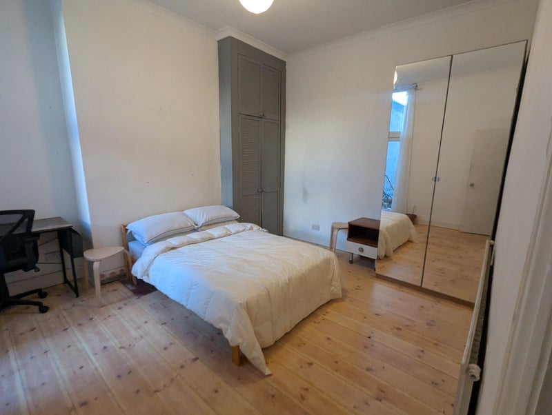 Newly refurbished large room with access to a big garden. I've just sanded the wood floors so the room is much brighter than it was and the living space has had a refit. The bedroom gets great light in the morning and the living room gets the evening sun. There's a bedframe and mattress already there, also a desk and 2 wardrobes. Happy to remove if you have your own.