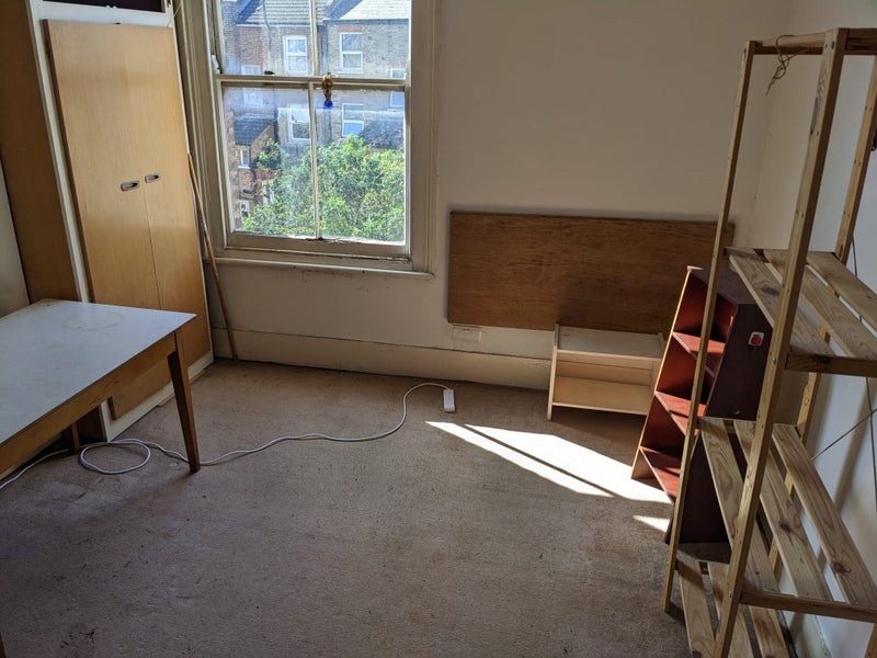 The room: The room to rent is an unfurnished double room, the size of an average Victorian small double. It has one window looking over the back gardens. There is an assortment of shelves and wardrobes in the flat that can be put into this room and we can discuss your needs. It does not currently have a bed and mattress so if you have a bed/ mattress that is a bonus! Although I may be able to source one.