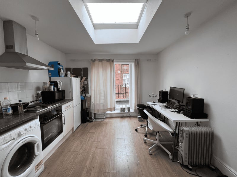 The bedroom and living area are separate, which is rare for a studio, great if you need a proper work space. Toilet and bathroom are separate too. Bedroom has a blackout blind so you get good light but can control it.