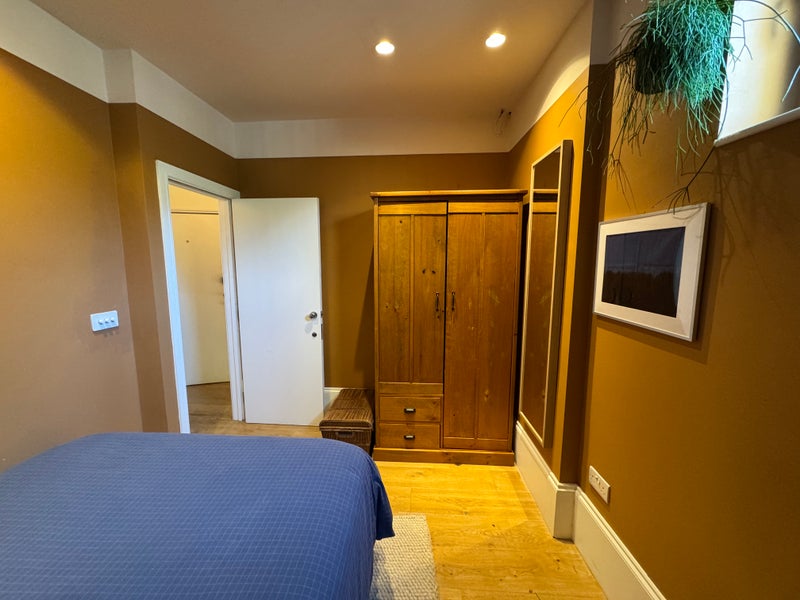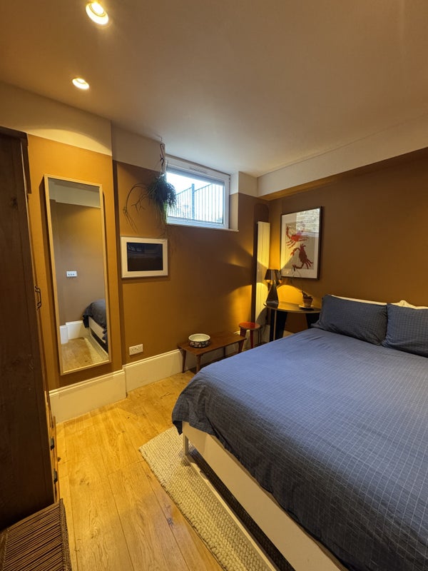 A quiet double at the rear of a carefully curated flat. Comfortable bed, blackout blinds and wardrobe included. The adjacent bathroom (not ensuite) has a rainfall shower.