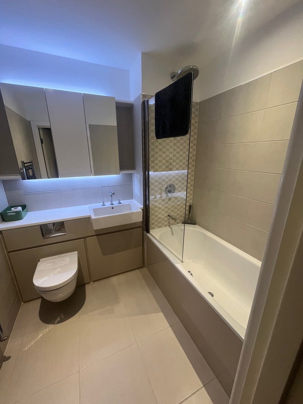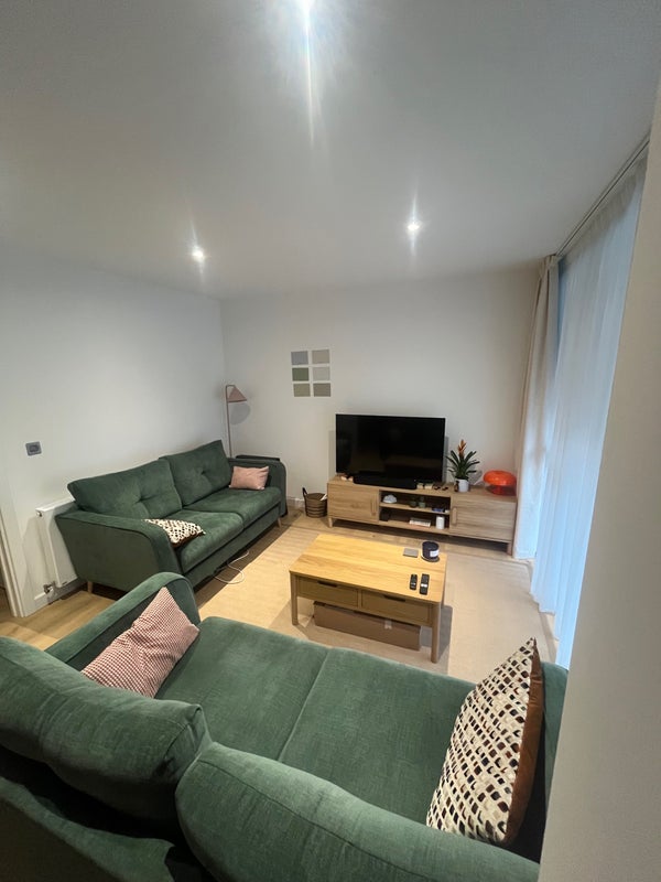 The flat has a bright kitchen and living area with lots of natural light. It’s a new build, so everything is modern and well-kept.