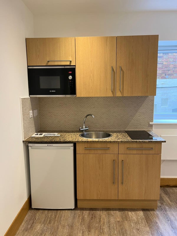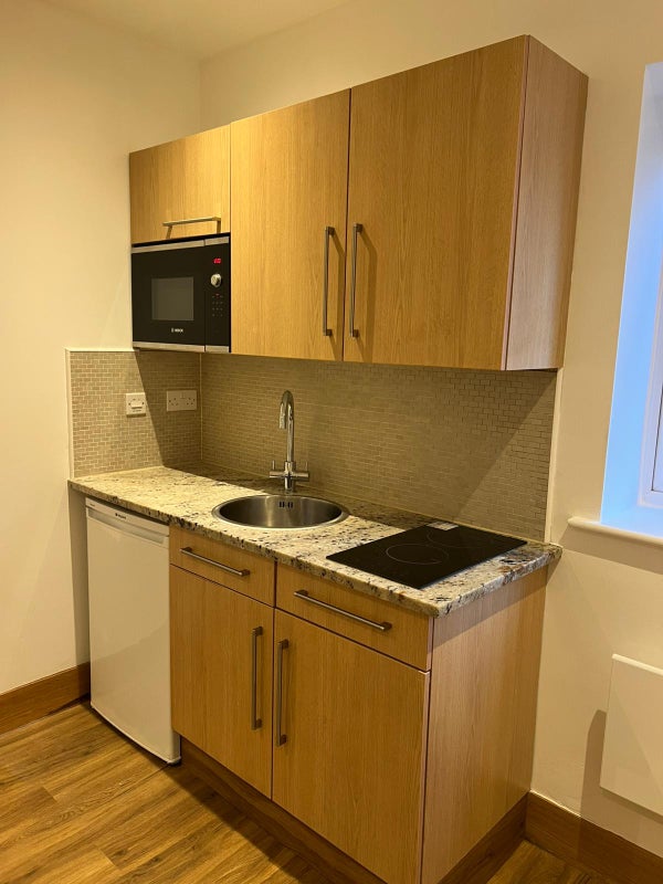 This bright and welcoming studio flat offers comfortable, easy living in a well-maintained property. The main room includes both the sleeping area and a compact kitchenette, creating an efficient layout ideal for anyone seeking a practical space. The kitchenette is perfect for simple meal preparation, and the flat features a private bathroom with modern fittings. Tenants also have access to a shared laundry area, adding convenience without extra upkeep. Situated in a convenient and well-connected location, the property is close to shops, transport links, and everyday amenities. A great option for anyone looking for an affordable, tidy, and well-situated home.