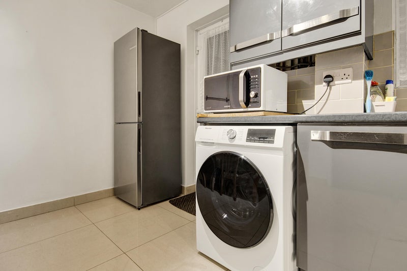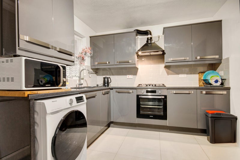 - Modern shared kitchen with gas stove, microwave, oven, fridge, freezer and washing machine