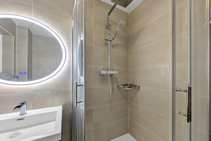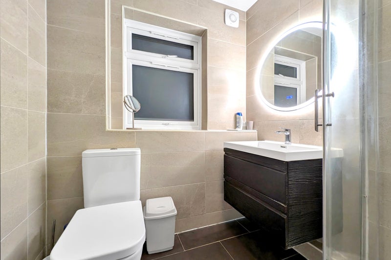 - 1 modern shared Bathroom with handheld and rainfall shower heads (shared with one other tenant)