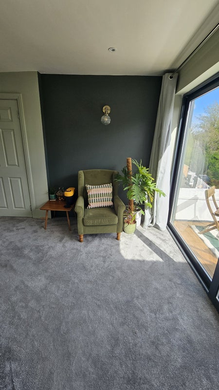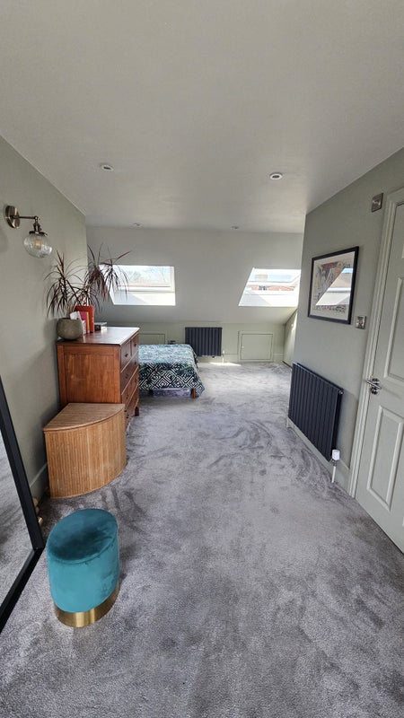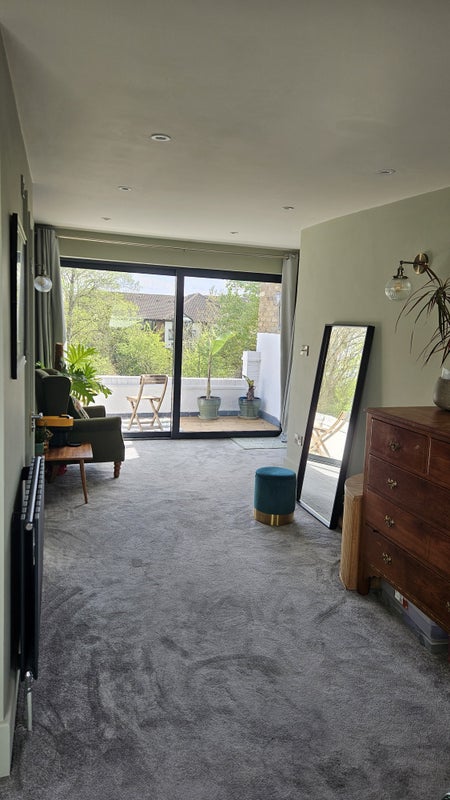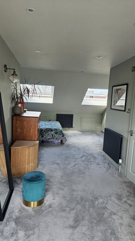 The room is furnished and features a King-size bed, a dedicated private seating area and coffee machine (and/or kettle for tea making if preferred)- ideal for a morning coffee or unwinding in your own space overlooking terrace and greenery/ garden. There is an ensuite bathroom that is completely private. There are blackout blinds and curtains on the windows. This is a lovely loft room providing a self-contained and private space. Bills and Wifi included.