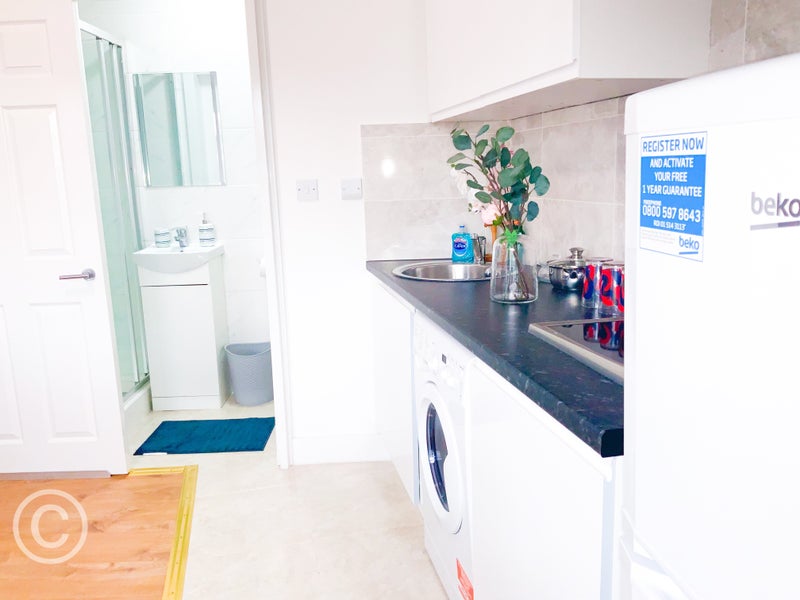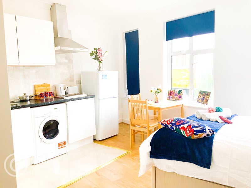 This is a 1st floor, studio flat on Cricklewood Broadway in London. You live, cook, and sleep in one space. There’s a sunny window, lots of storage, and a washer/dryer.