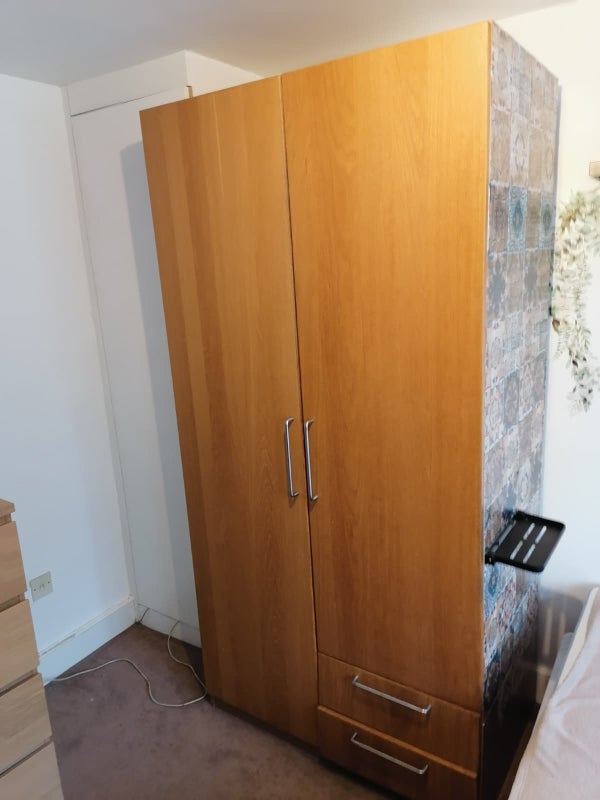 Ample storage: large wardrobe, chest of drawers, and shelving units.
