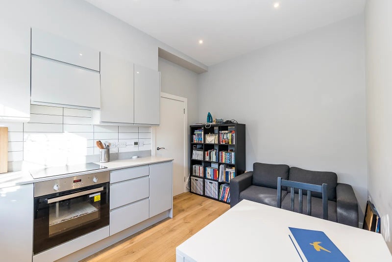 Large kitchen with small lounge / dining area, large bedroom and bathroom