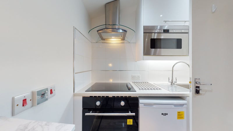 Available now. This studio is offered furnished, and the kitchenette includes a fridge, hob, oven, and storage.