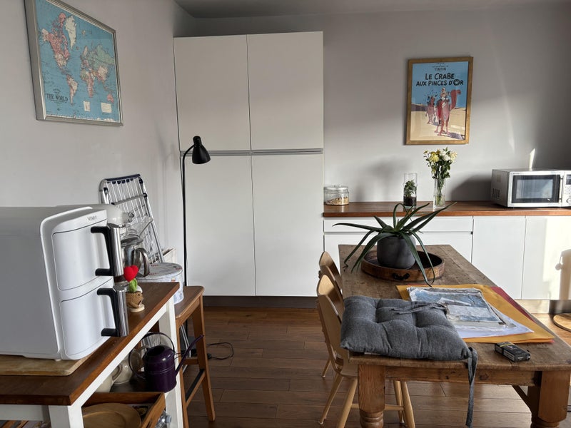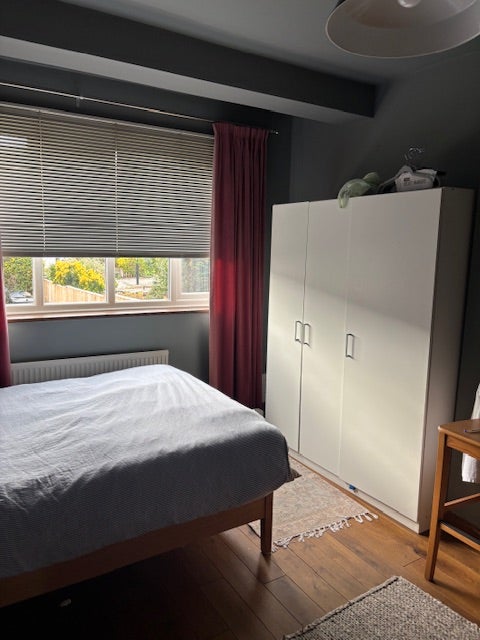 Luminous double bedroom on ground floor, facing front garden in 1930 3 bedroom house . Double bed solid wood, brand new matress, sofa, desk and wardrobe with plenty of storage space. Wooden floor throughout.