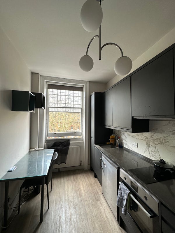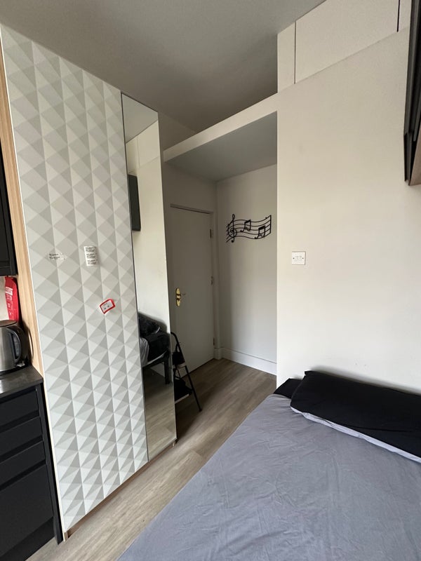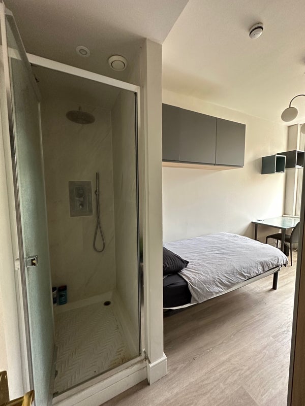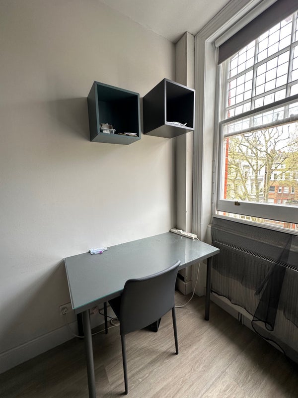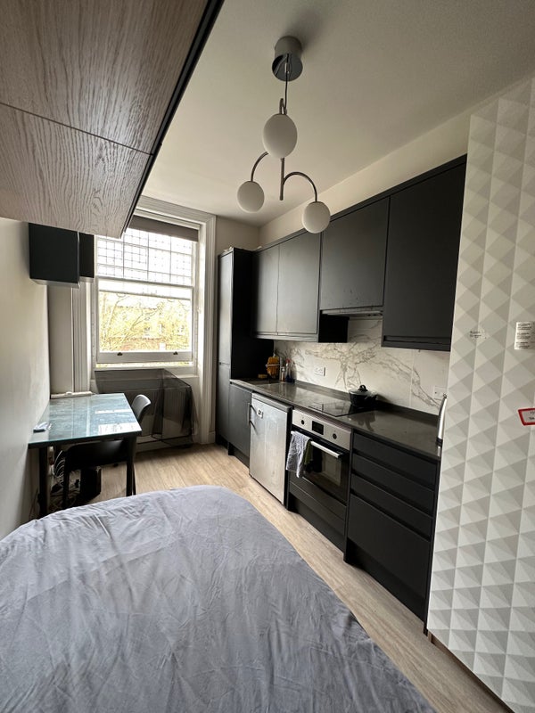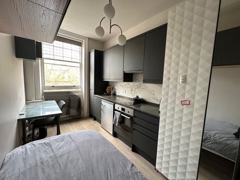 Fully renovated bright third floor single bedsit overlooking a pretty garden. It comprises a large single bed, kitchen with microwave/oven, fridge/freezer, 2 rings electric hob, own fully tiled shower. It is furnished for student and has wooden flooring. The toilet is shared with 1 person and cleaned regularly. Great storage capacity.