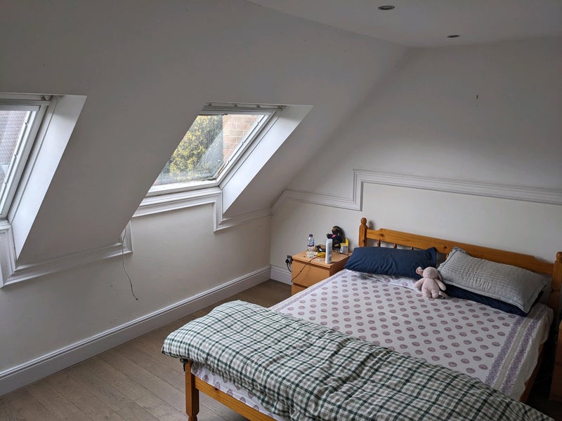 It's a beautiful double bed en-suite with large attic windows for plenty of daylight (sunlight floods the room on clear days.) The house sits within a residential colony with 24/7 security. Our backyard is just by a beautiful pond which hosts many kinds of birds and even turtles!