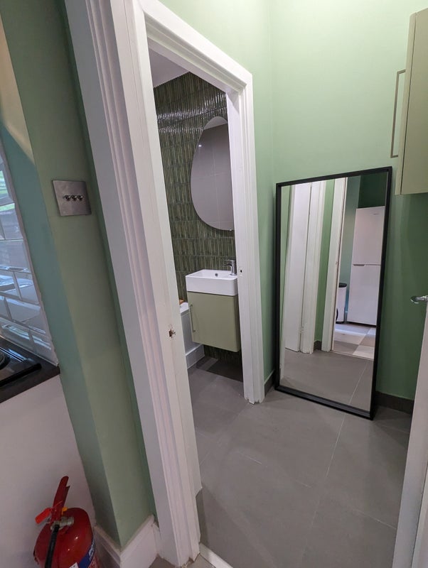 The flat has also an amazing relaxing bathroom has been fully refurbished everything there is new condition. Beautiful tiles luminous mirror storage and a small hallway between the bathroom and the kitchen room too. This flat it's the biggest in the building it's such a beautiful flat.