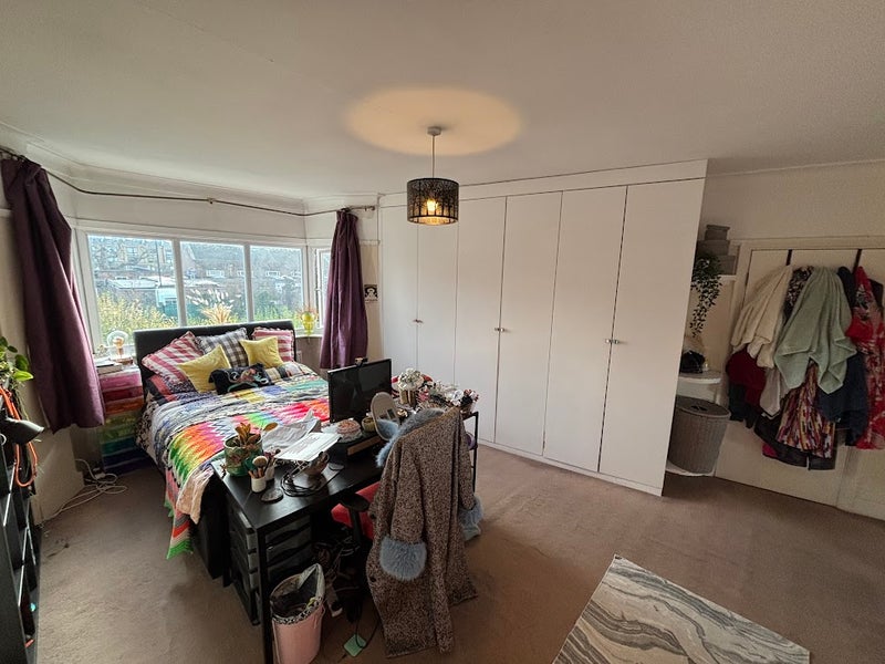 Bright and spacious double room overlooking a quiet front garden. Comes furnished with a double bed with storage inside, desk and computer chair, 2 large in-built wardrobes, in-built chest of drawers, and Ikea Kallax bookcase/storage.