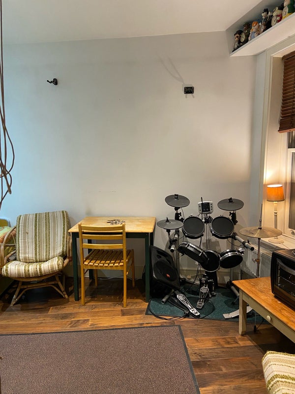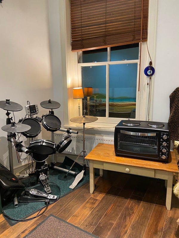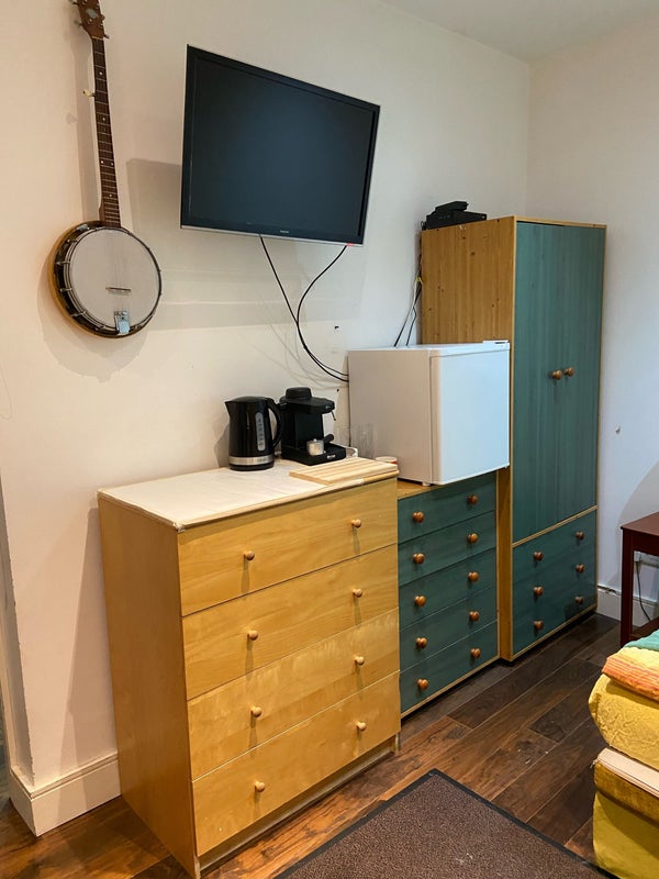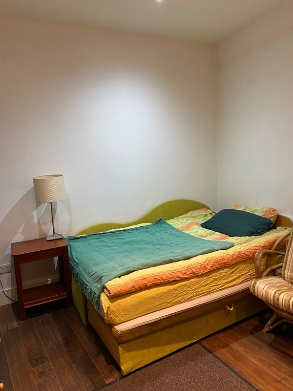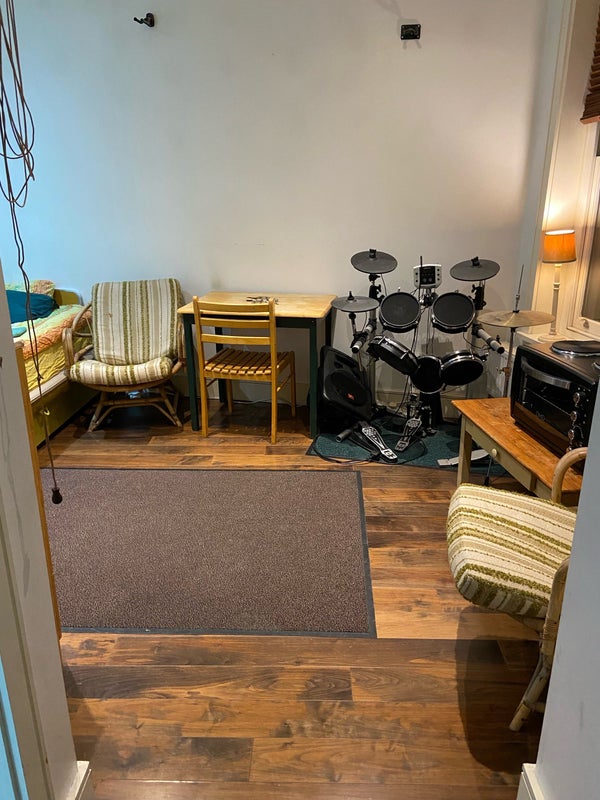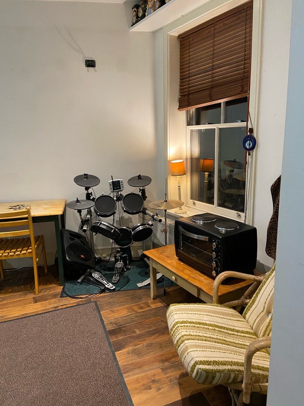 Double bed, bathroom en-suite, mini fridge, mini hob/ oven. No living room/ shared space. Furnished - including a drum set. Storage available to use: wardrobe, chest of drawers. Also desk, double bed, armchairs. Short term. Bills included. Internet included. Tv (virginmedia) included. Available from 1.4.26. Short let preferred 3-6 months. Not suitable for someone with own furniture looking for long term accommodation. Perfect for students or people visiting London for some months or who need accommodation part time. Cheaper then a hotel/ airbnb. Household got 2 dogs and 8 year old but room is self contained (studio).