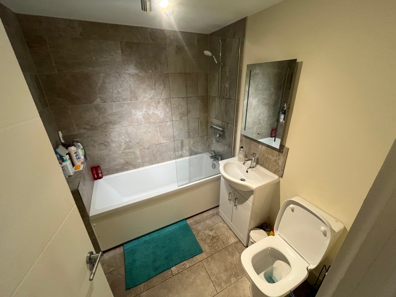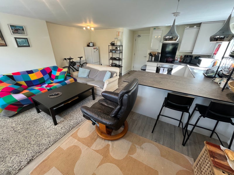 The flat is bright, modern, and well-kept, featuring a comfortable shared living space and kitchen, and a shared bathroom (shared with 1 other person).