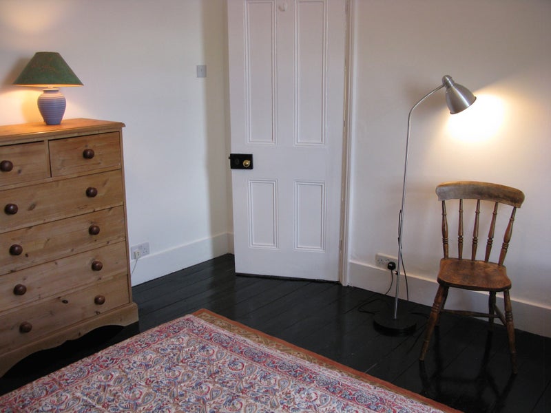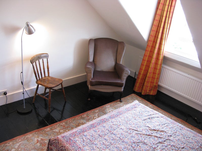 A beautiful, large room to rent on the top floor of a Victorian house in a quiet street near Crouch End. The room has white walls and painted wooden floorboards with rugs, a comfortable double bed, a built-in wardrobe, plus a chest of drawers, computer desk, book shelves, comfortable chair, bedside cabinet, lamps, etc.