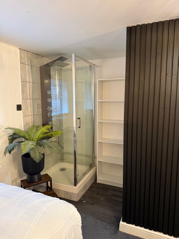 The room is located on the ground floor and the shower is situated within the bedroom.