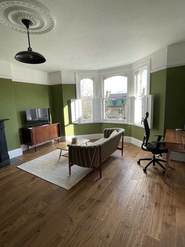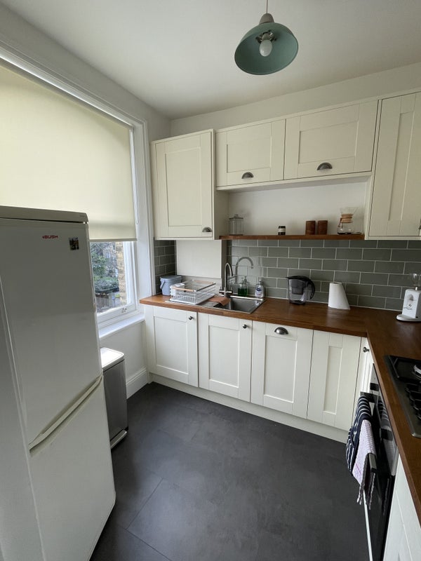 I’m looking for a professional person or couple to occupy the master bedroom overlooking the garden. The room has a high quality double bed, new large wardrobe and chest of drawers. You’ll also have use of the modern bathroom with bathtub and shower, a spacious living / dining room and fully equipped kitchen. All rooms are wonderfully airy due to high ceilings. The flat is fully furnished including TV and appliances. There’s a desk and desk chair should you be working from home.