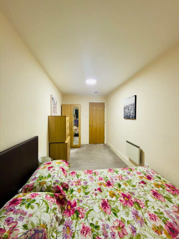 Bright and fully furnished double room available in a modern development in Canary Wharf. The room includes a comfortable double bed, wardrobe, chest of drawers, and mirror. Enjoy a beautiful river view directly from your window — peaceful and relaxing atmosphere.