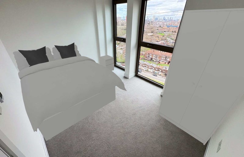 Room furnished with double bed, wardrobe and bedside table. IKEA mockup included in images.