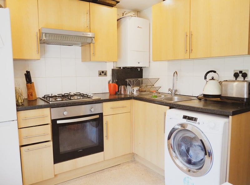 Our kitchen is at the back of the house with possible access to a roof in the summer, and we have a separate living room at the front of the house. The bathroom is shared between you and one other flatmate as one of the other bedrooms has an en-suite.