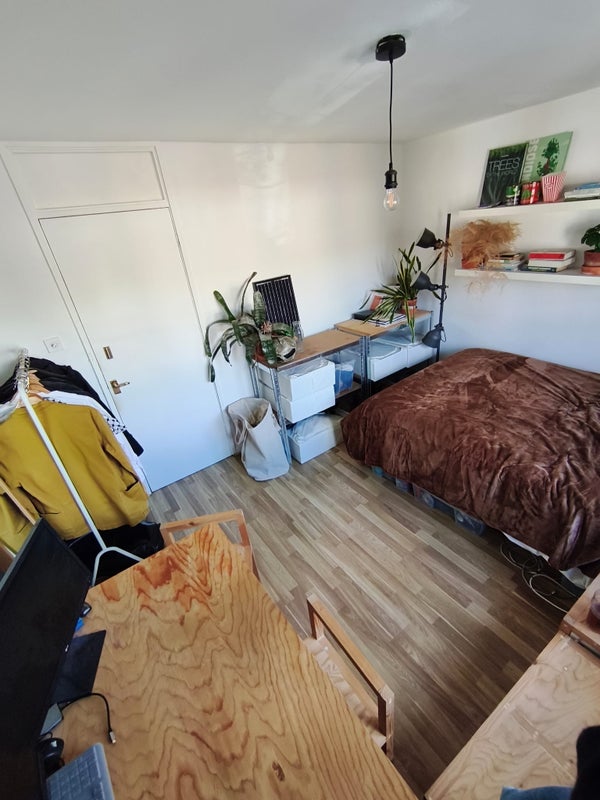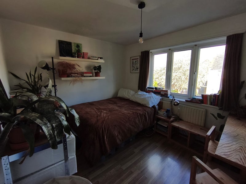 The double room comes furnished, has bright light, front garden view and space for a desk and or sofa.