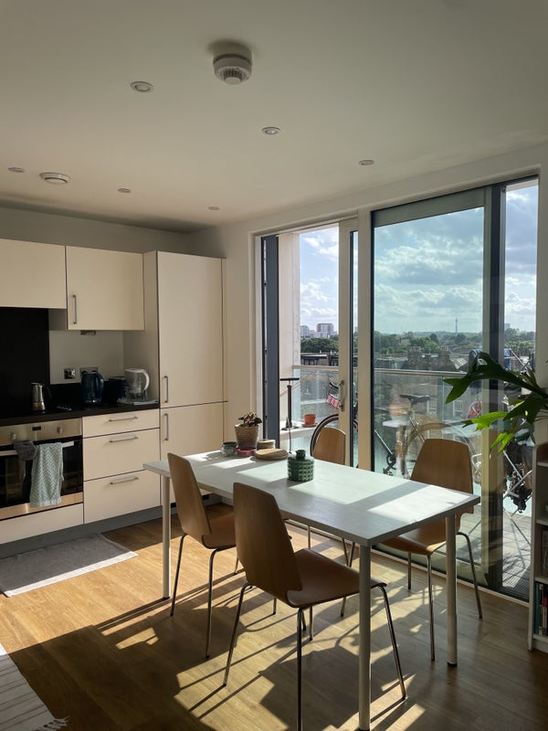 Hello! A room is becoming available in our bright, homely Dalston flat from 1st August (potentially sooner) and we're looking for a new flatmate to move in. The room is a medium-sized double and you would be sharing the bathroom with one other person. The flat has a spacious kitchen-diner, a large balcony with a good view and the building is just over 10 years old so it's very modern, warm and well insulated. The building has a concierge and a gym for residents. There is also a roof terrace in the building.