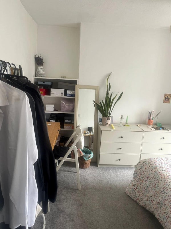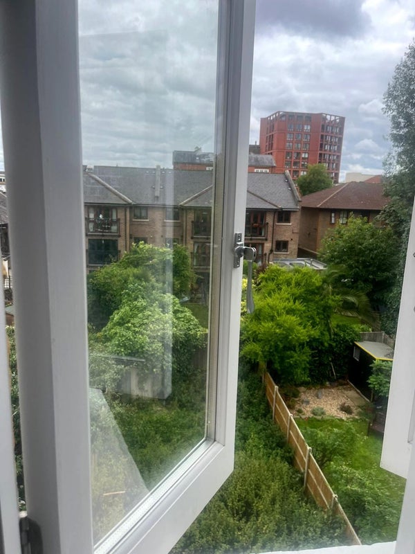 The bedroom is east facing and gets a lot of sun in the morning, and the view from the window is looking out into our downstairs neighbour's garden so its a peaceful room without noise from the street. The room has a built-in closet + shelves, and the room comes unfurnished though the previous flatmate will be selling the bed frame and chest of drawers for £100.