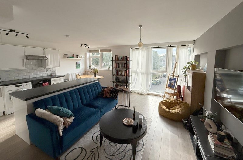 Spacious, bright 2 bed flat overlooking De Beauvoir Gardens. Open-plan living/kitchen with big windows, large sofa, dining area and plenty of shelving. Perfect for relaxing, WFH, or having friends over.