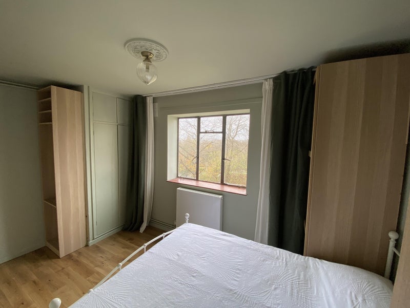 A calming, misty green double bedroom with a new OTTY mattress, one built-in wardrobe, and three additional wardrobes. Desk and chair available if you want them. The view is fantastic, you can see the London Eye fireworks on New Year's Eve.