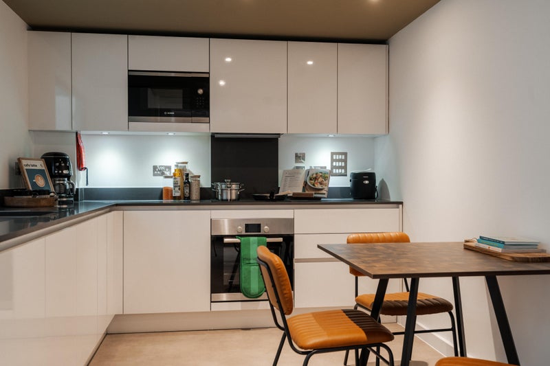 Your boutique apartment comes room comes fully furnished with a small double bed, study desk, and plenty of storage. Underfloor heating, designer kitchen finishes, and a washer-dryer in every apartment as standard. Access to the building is completely secure with a 24/7 concierge team on hand to help with everything you need.