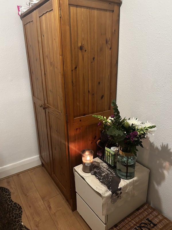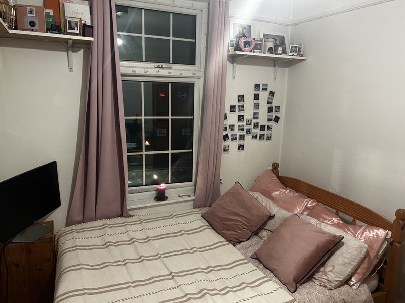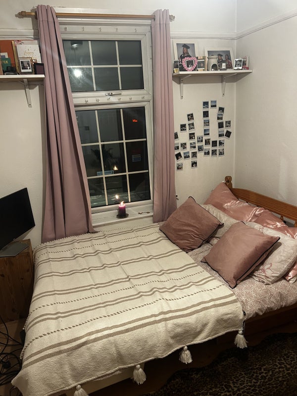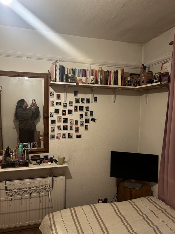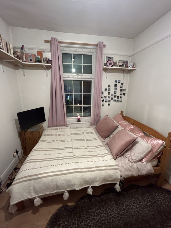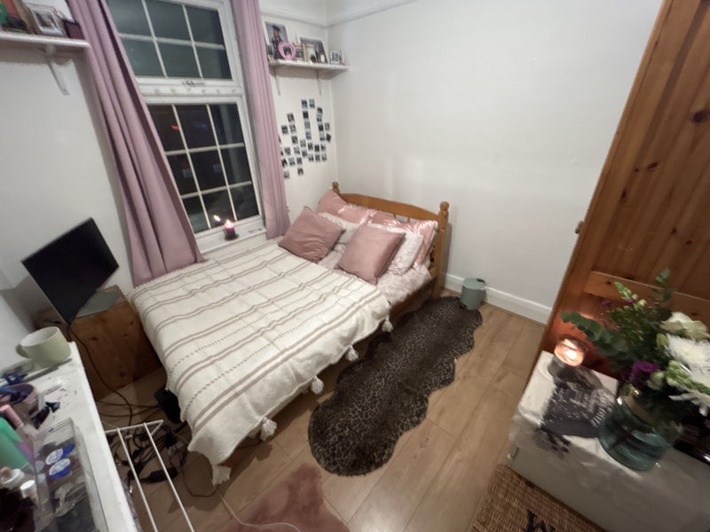 The room comes furnished with a double bed, an oak wardrobe, mirror, two side desks and shelving, with wooden flooring and painting job done a year ago.
