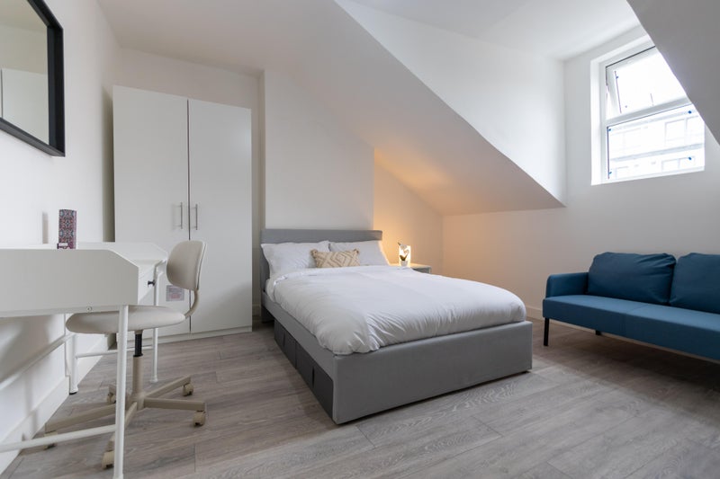 The room comes with double bed, wardrobe, small sofa, desk and chair, along with a small fridge and it's own private bathroom.